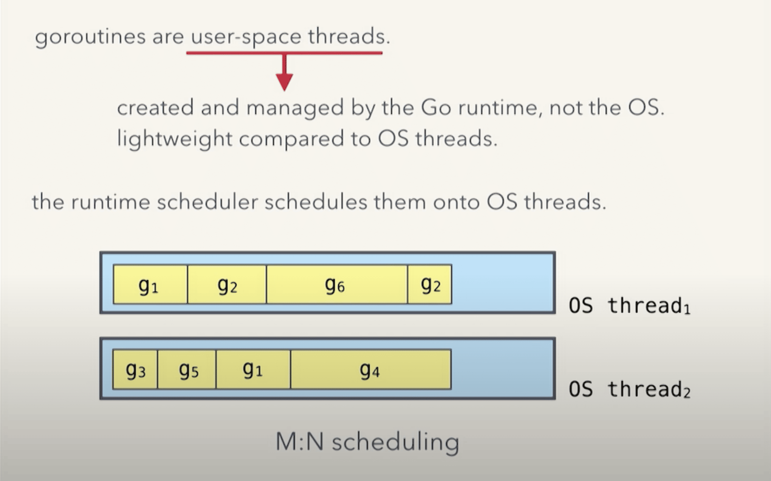 这实际上意味着你可以同时运行许多 goroutine 而开销很小,并且它们在底层运行在多个操作系统线程上,能够利用服务器中的所有 CPU 核心。这一点非常重要,因为如果你碰巧在某个 goroutine 中执行非常消耗 CPU 的操作(比如反序列化一个大型 JSON 结构),其影响会比你使用单线程运行时(如 Node.js)要小(在 Node.js 中,你需要为阻塞线程的操作创建 worker 线程或子进程),或者比使用 Python 的 async/await 也要好。